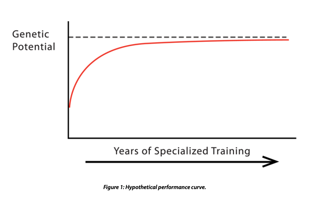 Figure 1 could represent any activity. The Y-axis could be your genetic potential for the press or your 10-kilometer run time. You could draw literally an infinite number of these curves for any activity and power output. However, it is not possible get very close to the limit of your genetic potential in all of these activities. Nobody can run a 2.5-hour marathon and deadlift 700 lb. It is simply not possible to get really close to your genetic potential in such vastly different events for several reasons: