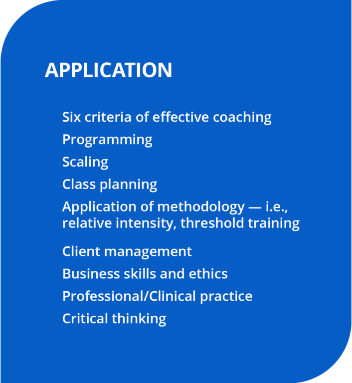 Knowledge creates the foundation and is essential for coaching, but it is not alone sufficient to make the coach effective. If it were, the greatest gyms would be run by Ph.Ds. To put knowledge into practice, the coach needs to be able to apply knowledge in the right way and at the right time. This is the second area of coach development: APPLICATION. A great coach has the ability to apply their knowledge and skills for any athlete in any context.