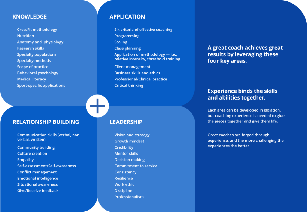 Knowledge, application, relationship building, and leadership can be developed as isolated skill sets, but a coach needs experience to glue the pieces together and bring them to life. Ultimately, great coaches are forged through experience, and the more challenging the experiences the better. Without adequate experience, the coach is just a hodgepodge of tricks.